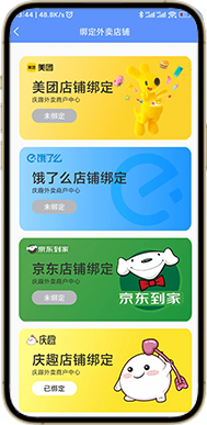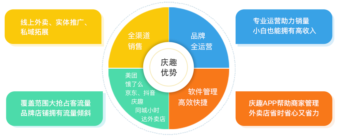 与美团、饿了么、京东到家抖音合作,公司负责建立美团、饿了么、京东、抖音、庆趣品牌外卖店